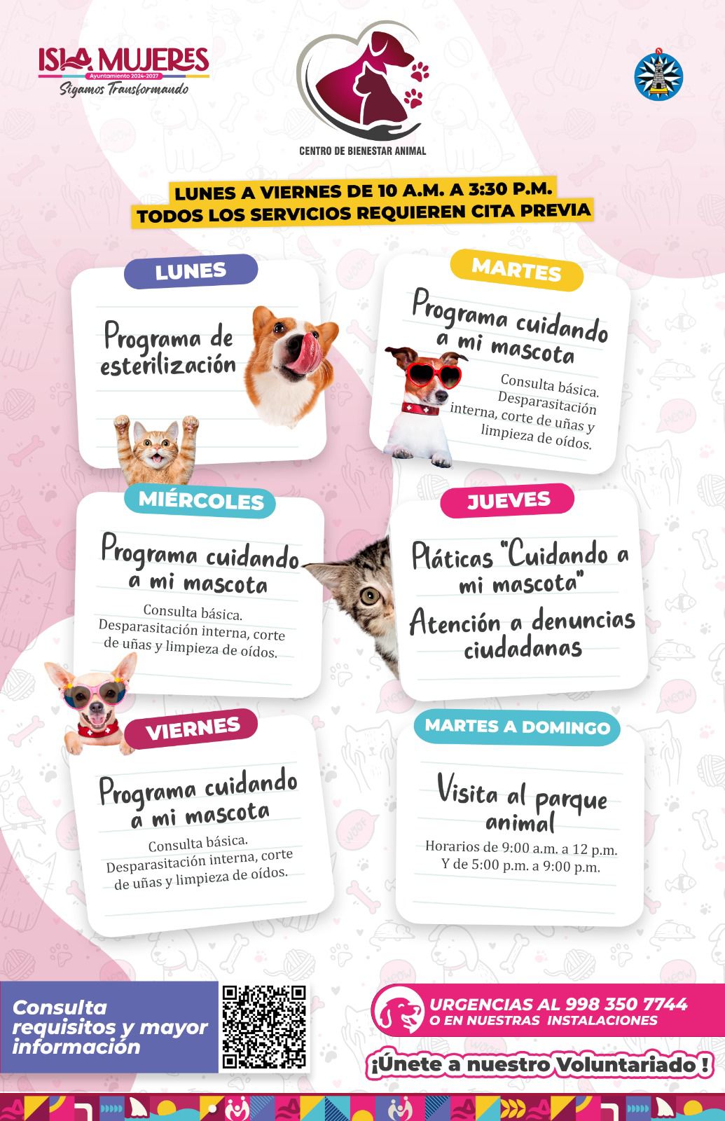 La Dirección de Medio Ambiente y Ecología dio a conocer el calendario de servicios disponibles en horario de 09:00 a 15:30 horas, informando que los lunes se ofrece esterilización, los martes, miércoles y viernes consulta básica, desparasitación, corte de uñas y limpieza de oídos, los jueves pláticas sobre el cuidado de mascotas y atención a denuncias ciudadanas y los viernes. Para acceder a estos servicios es necesario agendar una cita al número telefónico 9983507744.