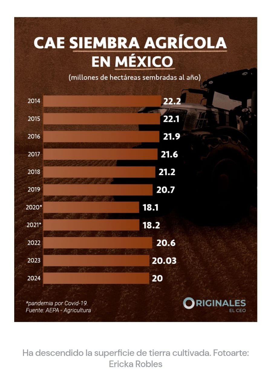 Un análisis del proyecto periódico digital EL CEO revela que en los últimos 10 años se han dejado de cultivar 2.2 millones de hectáreas en todo el país. En 25 de los 32 estados ha caído la cantidad de tierra cultivada.