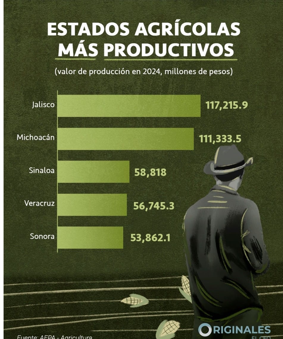 Tal es el caso de Jalisco —cuna de uno de los cárteles más grandes del país— es la entidad con mayor valor de producción agrícola: a lo largo del año pasado, registró 1.5 millones de hectáreas cosechadas y 117,215.9 mdp en valor