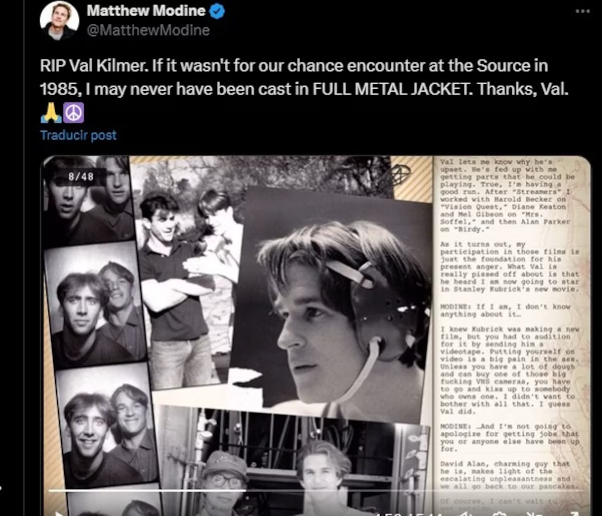 Modine, por su parte, escribió en X: “Si no hubiera sido por mi encuentro casual con Val en 1985, tal vez nunca habría sido elegido para Full Metal Jacket. Gracias, Val”.