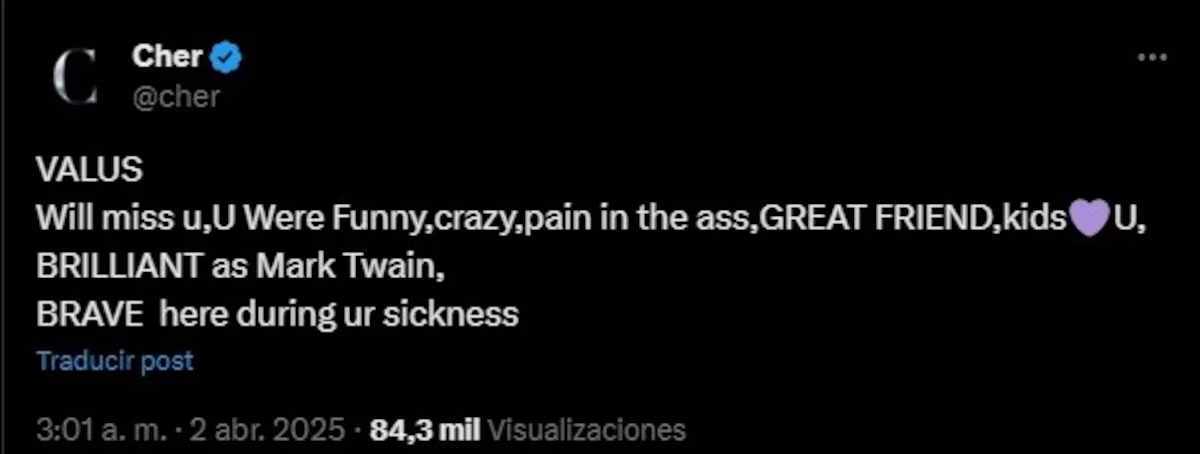 Tras la muerte de Val Kilmer a los 65 años el pasado 1 de abril, Cher, quien fue su pareja en los años 80, le dedicó un emotivo mensaje en redes sociales, en el que destacó su valentía durante su enfermedad.