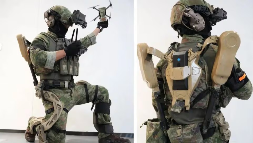 El soldado, mostrado en fotografías, lleva un prototipo de exoesqueleto y “sostiene un pequeño dron”