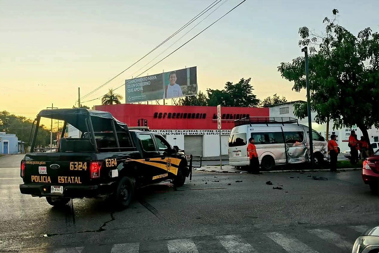 MÉRIDA, YUC.- 6 de septiembre.- Un accidente de tránsito entre una camioneta de transporte de personal y una patrulla de la Secretaría de Seguridad Pública (SSP) se registró la mañana de este sábado en la avenida Itzáes con calle 65-A, en el Centro de la ciudad.