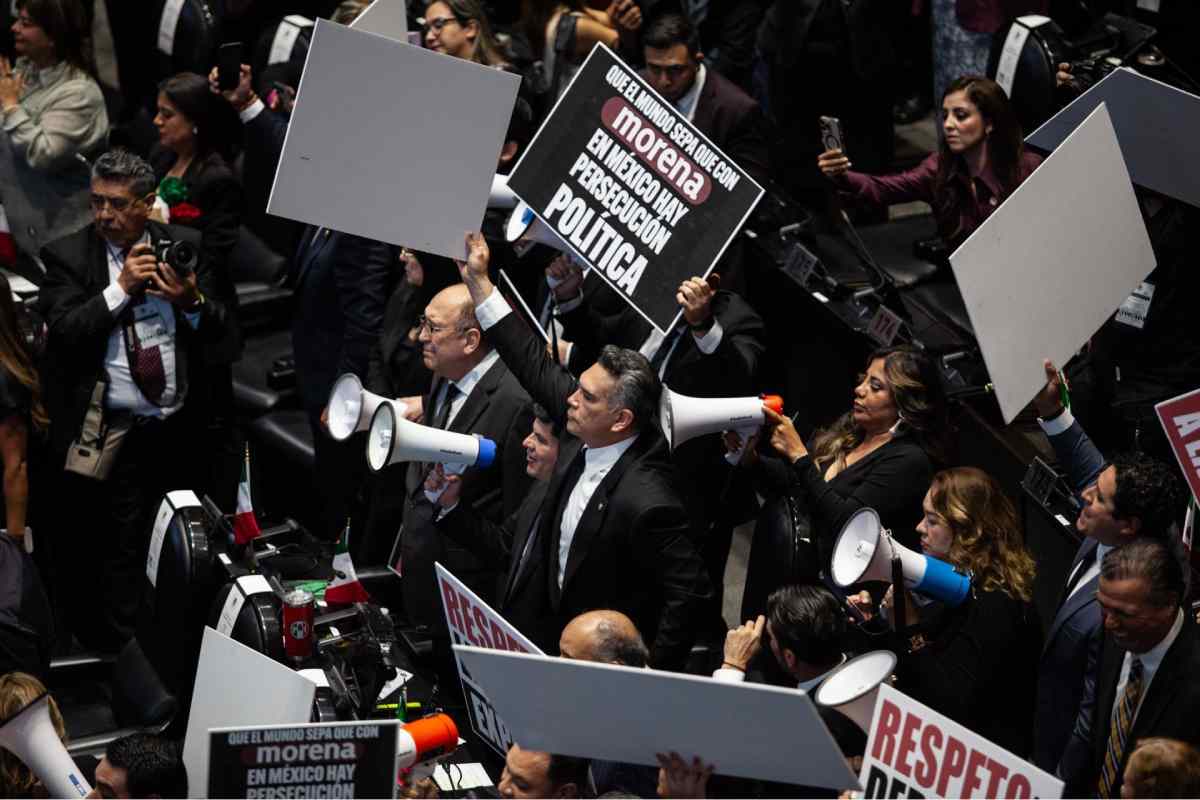 “¡Narcopartido! ¡Narcopartido! ¡Narcopartido!”, gritaron los priistas cuando entraron a la sesión de Congreso General con sus megáfonos que emitían sonidos de sirenas. Esto duró unos diez minutos.