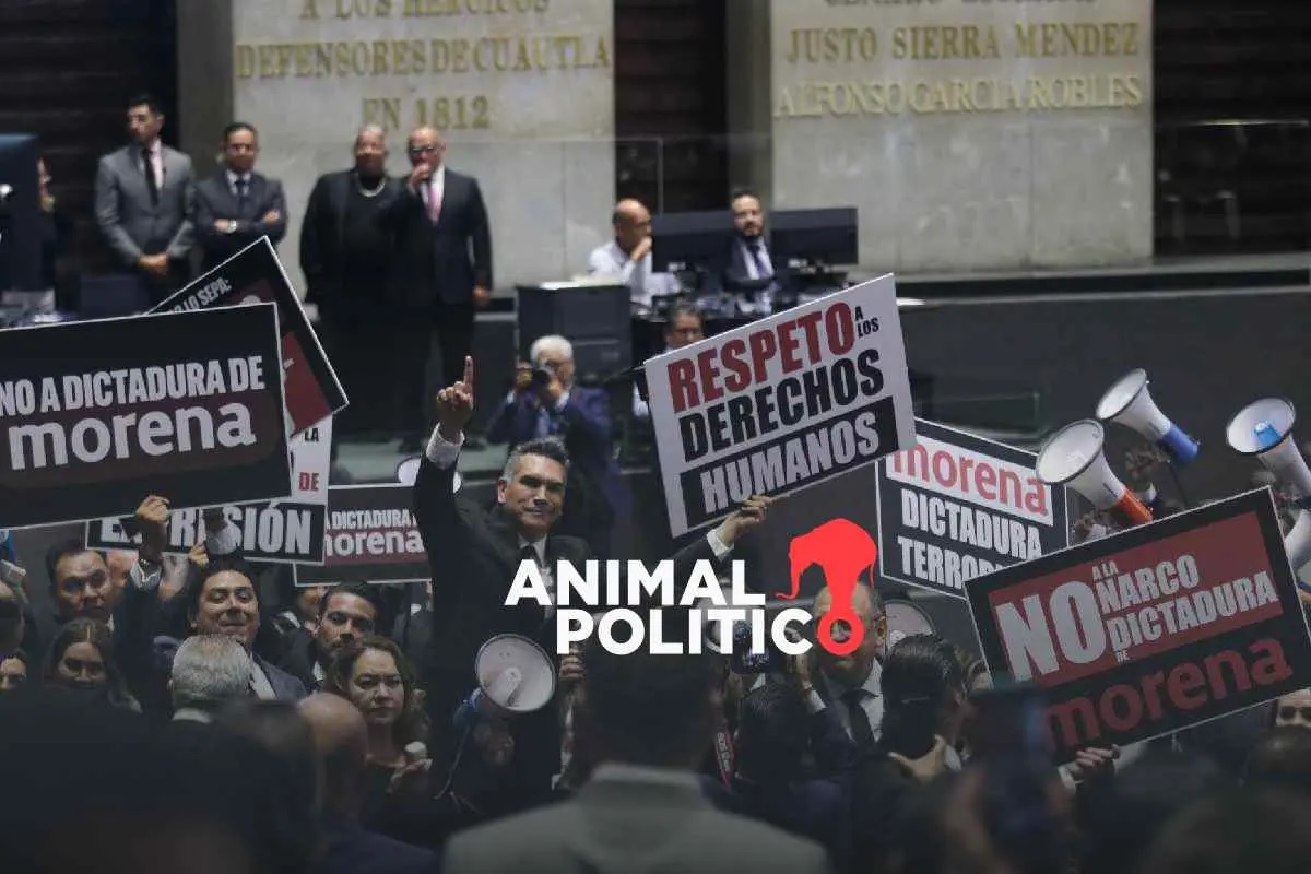 “¡Narcopartido! ¡Narcopartido! ¡Narcopartido!”, gritaron los priistas cuando entraron a la sesión de Congreso General con sus megáfonos que emitían sonidos de sirenas. Esto duró unos diez minutos.
