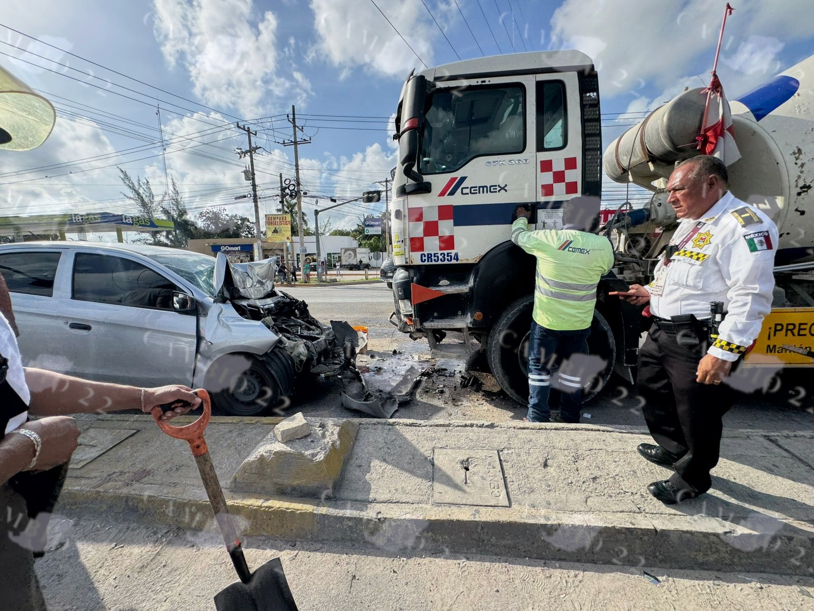 CANCÚN, QRoo, 25 de agosto de 2025.- El caos se apoderó de la Avenida José López Portillo esta mañana, cuando un sedán terminó hecho pedazos tras chocar de frente contra una revolvedora.