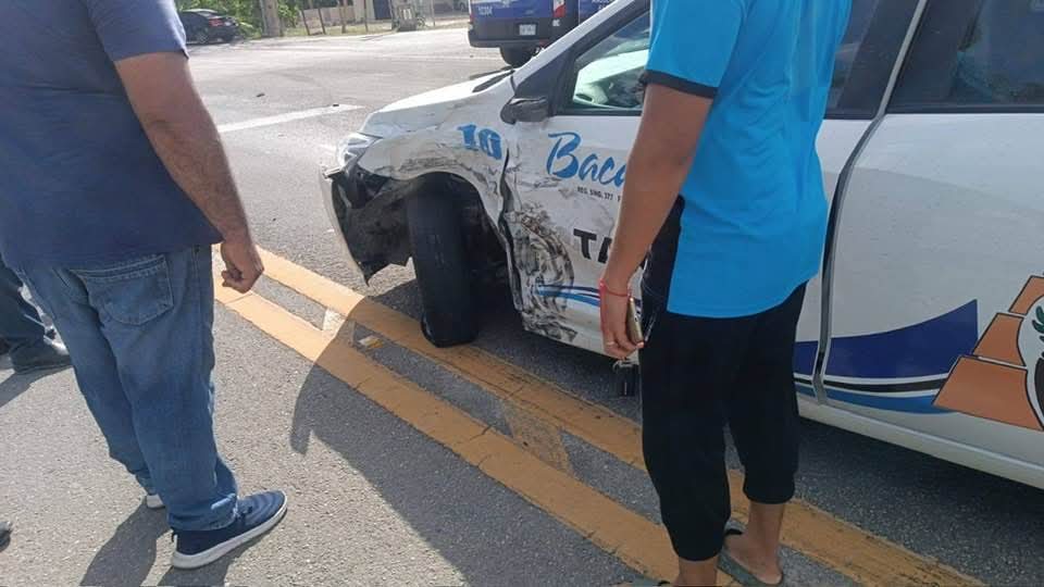 Chetumal, 31 de marzo.- El accidente ocurrió la tarde de este domingo en el entronque que conduce al poblado de Miguel Hidalgo, cuando un taxi con número económico 10 intentó reincorporarse a la vía federal y fue impactado por una camioneta que circulaba con dirección a Bacalar.
