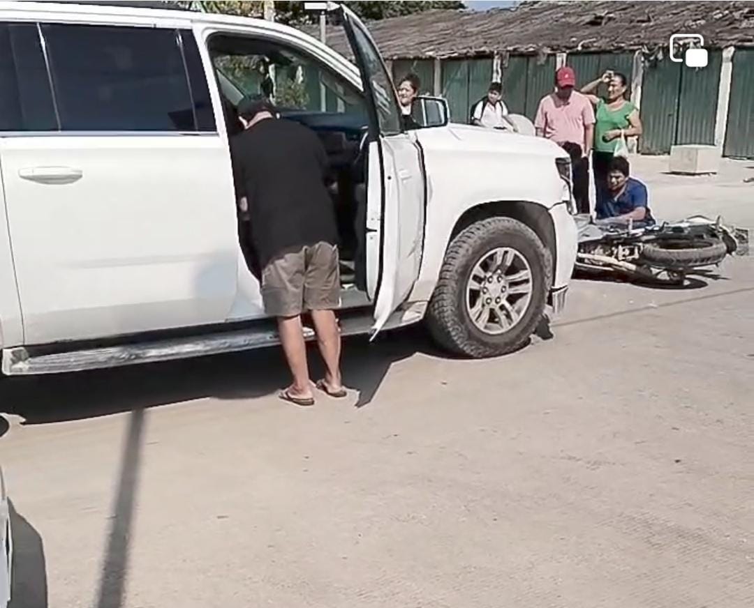 TULUM a 15 de enero.- Un accidente vial ocurrido la tarde de este miércoles en el cruce de las calles Venus Oriente y Osiris, en pleno centro de Tulum, dejó a un motociclista lesionado luego de que una camioneta tipo Suburban blanca, con placas UURH 165K, se pasara el alto y lo impactara.