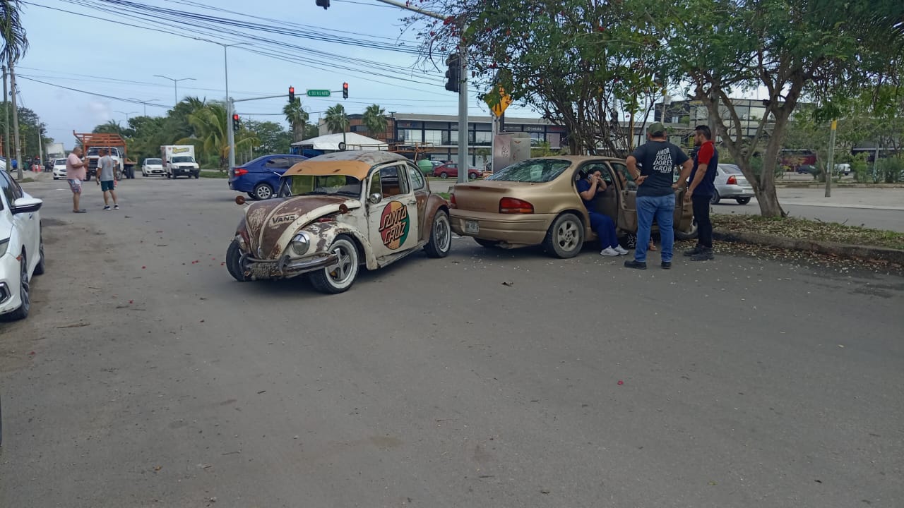Chetumal, 16 de febrero.- Un aparatoso accidente vehicular se registró en la avenida 4 de Marzo, en la colonia Fidel Velázquez. Un automóvil Volkswagen tipo Vocho, color óxido, presuntamente circulaba en la zona cuando, al llegar al cruce con la calle Erick Paolo Martínez, se impactó contra un Dodge Stratus, color café.
