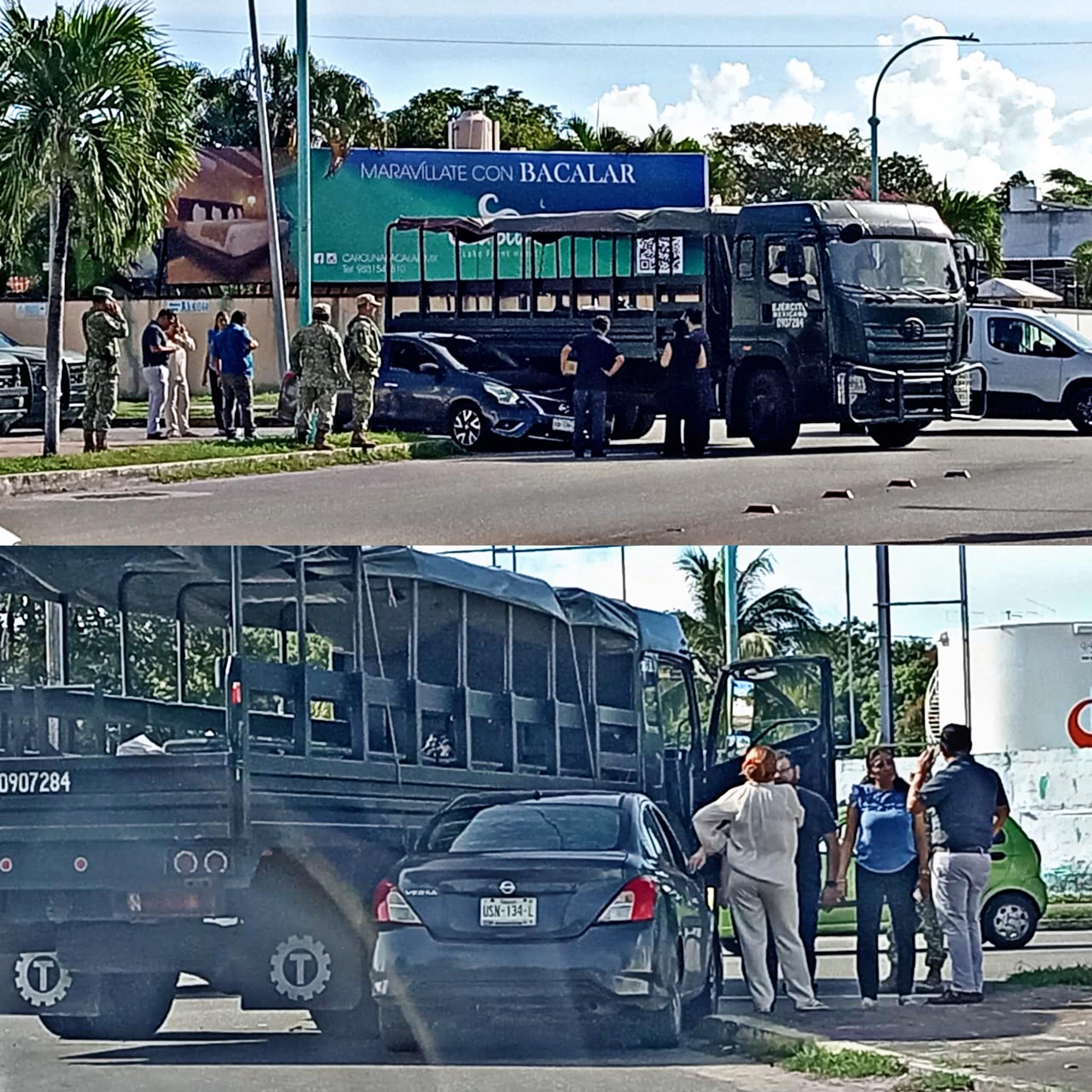 Chetumal, 4 de diciembre.- Un percance ocurrido la tarde de este jueves en una de las zonas de mayor flujo vehicular de Chetumal provocó la intervención inmediata de corporaciones de seguridad. El choque se registró en la intersección de la avenida Álvaro Obregón con Andrés Quintana Roo, donde un camión de la Secretaría de la Defensa Nacional (SEDENA) y un automóvil Nissan Versa quedaron involucrados en un incidente que generó daños materiales de consideración.