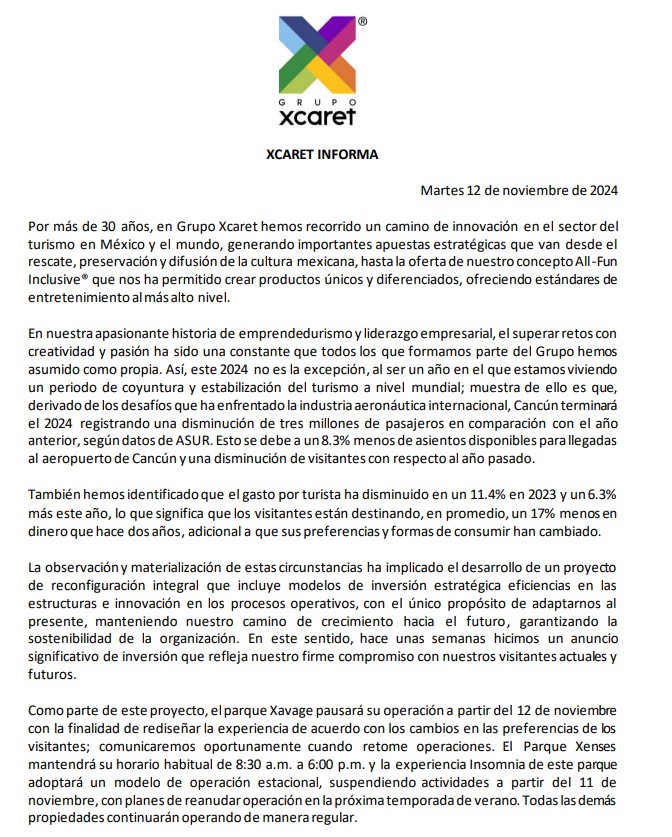Así lo informaba en un comunicado oficial Grupo Xcaret quien refería en noviembre pasado un año de coyuntura y estabilización del turismo a nivel mundial, lleno de desafíos en la industria aeronáutica internacional, lo que llevaría a cerrar el 2024 con una disminución de tres millones de pasajeros en comparación con el año anterior basado en datos de ASUR, por la disminución del 8.3% que se traía en la disponibilidad de asientos de avión. Además de otros factores que también refería como una disminución del gasto de turista.
