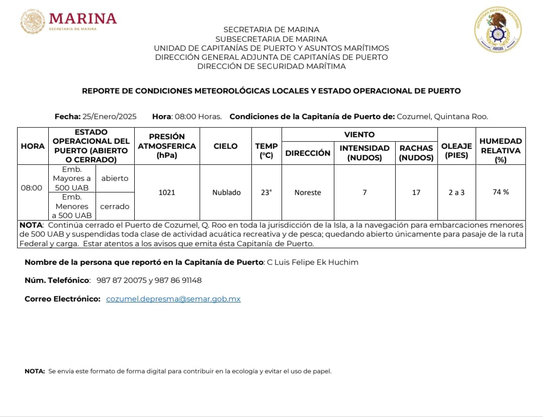 Luego de que ayer por la mañana se había reabierto de manera parcial el puerto a las embarcaciones de menos de 15 metros de eslora, volvió a cerrarse a partir de las 4 PM en toda la jurisdicción de Cozumel, por lo que se recomienda a la comunidad marítima mantenerse atenta de las condiciones climáticas en el área del pronóstico por la temporada de Frentes Fríos.