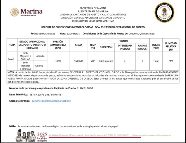 COZUMEL, Q. Roo, 6 de marzo.- A partir de las 06 AM de este jueves se cierra el Puerto de Cozumel a la navegación para todo tipo de embarcaciones menores de recreo, deportivas y de pesca, además de que quedan suspendidas todas las actividades de turismo náutico, en el área que comprende desde Playa Barracuda hasta Punta Molas (lado Norte) y toda la zona oriental de la isla, por lo que se recomienda mantenerse atentos a los avisos que emita la autoridad portuaria por el desarrollo de las condiciones meteorológicas.