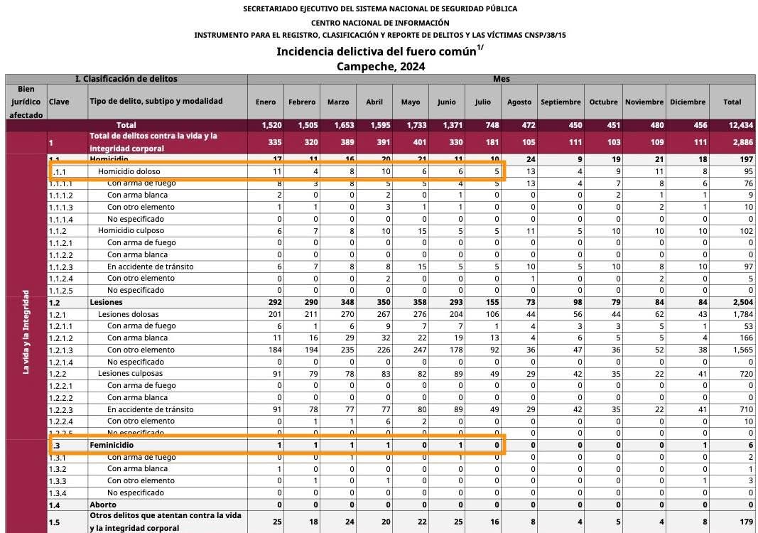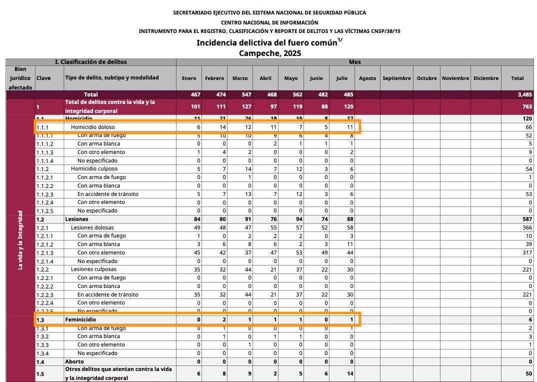 San Francisco de Campeche, Campeche, 22 de agosto.- Coincidentemente con publicaciones nacionales, el Secretariado Ejecutivo del Sistema Nacional de Seguridad Pública (SESNSP), mediante su Centro Nacional de Información precisó que los hechos delictivos del fuero común en Campeche tuvieron un sensible incremento, pues de enero a julio del 2024 se registraron 50 hom¡c¡dios dolosos y 5 feminicidios, mientras en el mismo lapso de este año las cifras son de 66 y 6, respectivamente.