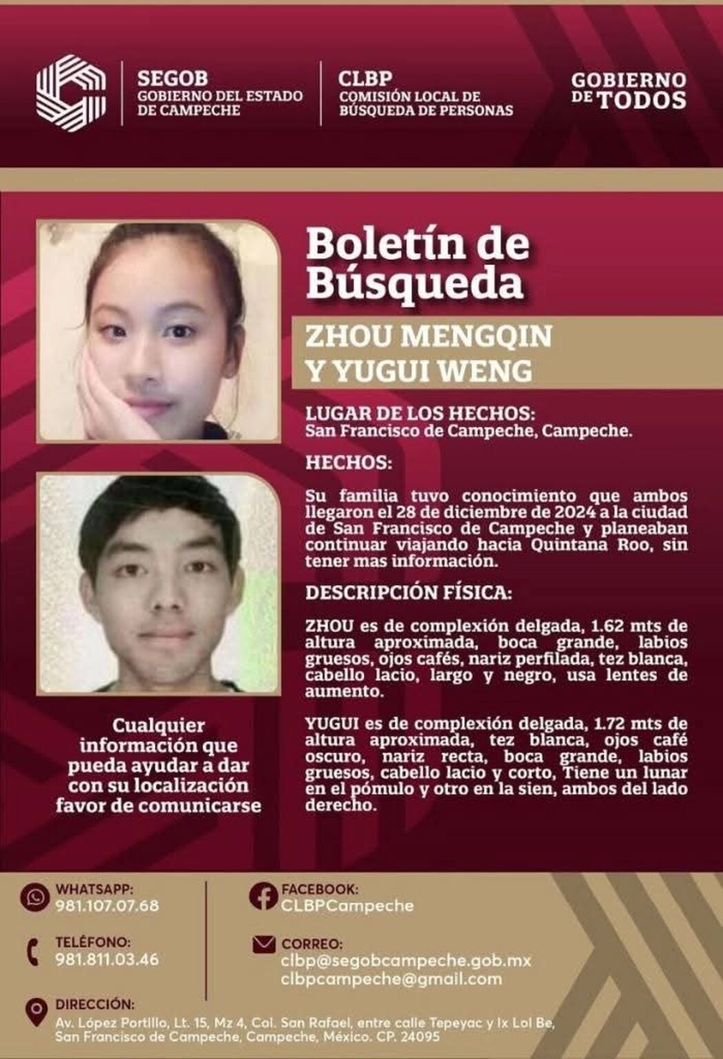 El segundo caso ocurrió el 28 de diciembre de 2024, cuando los ciudadanos chinos Yugui Weng (27 años) y Zhou Mengqin (21 años) fueron vistos por última vez en Campeche. Tenían planeado continuar su viaje hacia Quintana Roo, pero nunca llegaron. La Comisión de Búsqueda de Personas y la FGECAM emitieron fichas de búsqueda, pero hasta la fecha no han sido localizados.