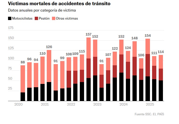 En México, durante el último año, murieron 4.654 personas víctimas de accidentes de tránsito y se registraron más de 85.000 heridos. Aunque la tendencia internacional es que el 30% de las muertes se registran entre los vehículos con motor de dos o tres ruedas, de acuerdo con la Organización Mundial de la Salud, en Ciudad de México más del 40% de las víctimas mortales son motociclistas y el 20% peatones. El grupo de los motociclistas es el que más ha incrementado el total de los fallecidos durante los últimos años. Para 2019 representaban menos del 25% de las víctimas, ahora se mantienen entre el 43% y el 47%. De acuerdo con el colectivo Céntrico, conformado por especialistas en movilidad urbana sustentable, la mayor proporción de muertes por motos se localiza en el Estado de México, Veracruz y Ciudad de México.