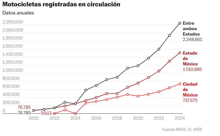 La presencia de motos ha incrementado en la capital del país y en el vecino Estado de México. Entre el 2020 y el 2024, el registro de este tipo de unidades creció un millón de unidades. Esto sin tomar en cuenta las motocicletas que emplean placas de otros Estados, así como aquellas que están fuera del registro.