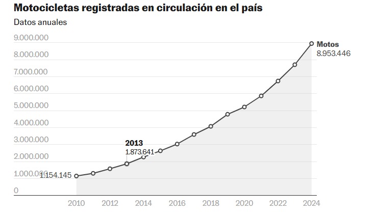 El crecimiento es parecido en todo el país. En 2020 había cinco millones, mientras que para 2024 la cifra aumentó hasta acercarse a los nueve millones. Los expertos en movilidad, como Víctor Alvarado, maestro en políticas públicas, relacionan este incremento con el uso de los aparatos motorizados como fuente de trabajo. Con la creación de aplicaciones que facilitan el transporte, los ciudadanos han optado por utilizar las motos como una herramienta de empleo.