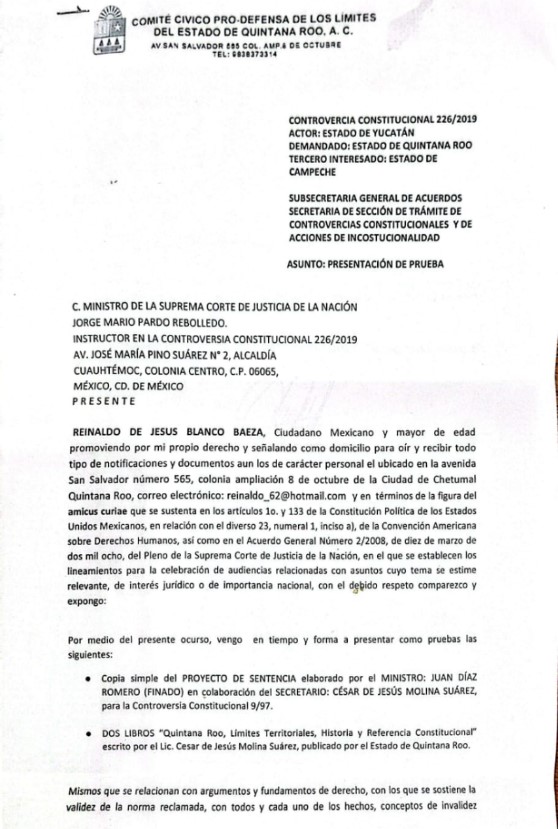 En su escrito, señala que comparece en términos de la figura del “amicus curiae” para aportar las pruebas consistentes en la copla simple del Proyecto de sentencia del ministro Juan Díaz Romero, ya fallecido, con la colaboración del secretario César Jesús Molina Suárez, para la Controversia Constitucional 9/92, que daba a la razón a Quintana Roo contra Campeche por la creación del municipio de Calakmul, pero que no obtuvo resolución porque el expediente fue archivado por una decisión política que mandó las controversias de límites al Senado.