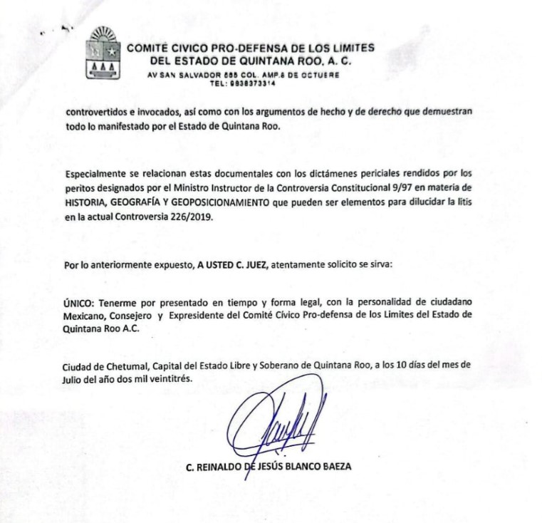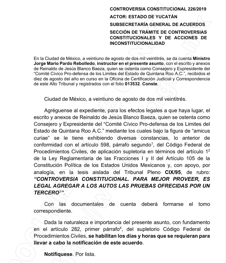 Cabe agregar que Reynaldo Blanco Baeza, quien dejó la presidencia del Comité Pro-Defensa de los Límites de Quintana Roo en el 2022, informó que remitió su escrito y aportación de pruebas el 23 de julio del 2023 mediante correo certificado, que fueron recibidos en la Oficina de Certificación Judicial y Correspondencia de la SCJN el 10 de agosto y fueron admitidos por el ministro instructor para integrarlas al expediente el 21 del mismo mes.