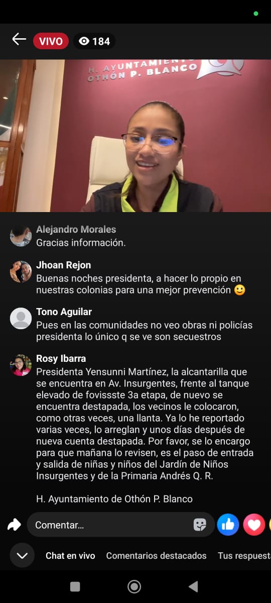 CHETUMAL, 12 de noviembre. – Mientras la presidenta municipal Yensunni Martínez Hernández realiza transmisiones en vivo para informar sobre acciones del ayuntamiento, los ciudadanos continúan utilizando estos espacios para lanzar reclamos que, una y otra vez, quedan sin respuesta efectiva. En la más reciente transmisión, comentarios sobre inseguridad, abandono de servicios públicos y denuncias reiteradas volvieron a copar el chat, evidenciando una desconexión entre el discurso oficial y la realidad de las colonias y comunidades rurales.