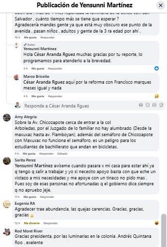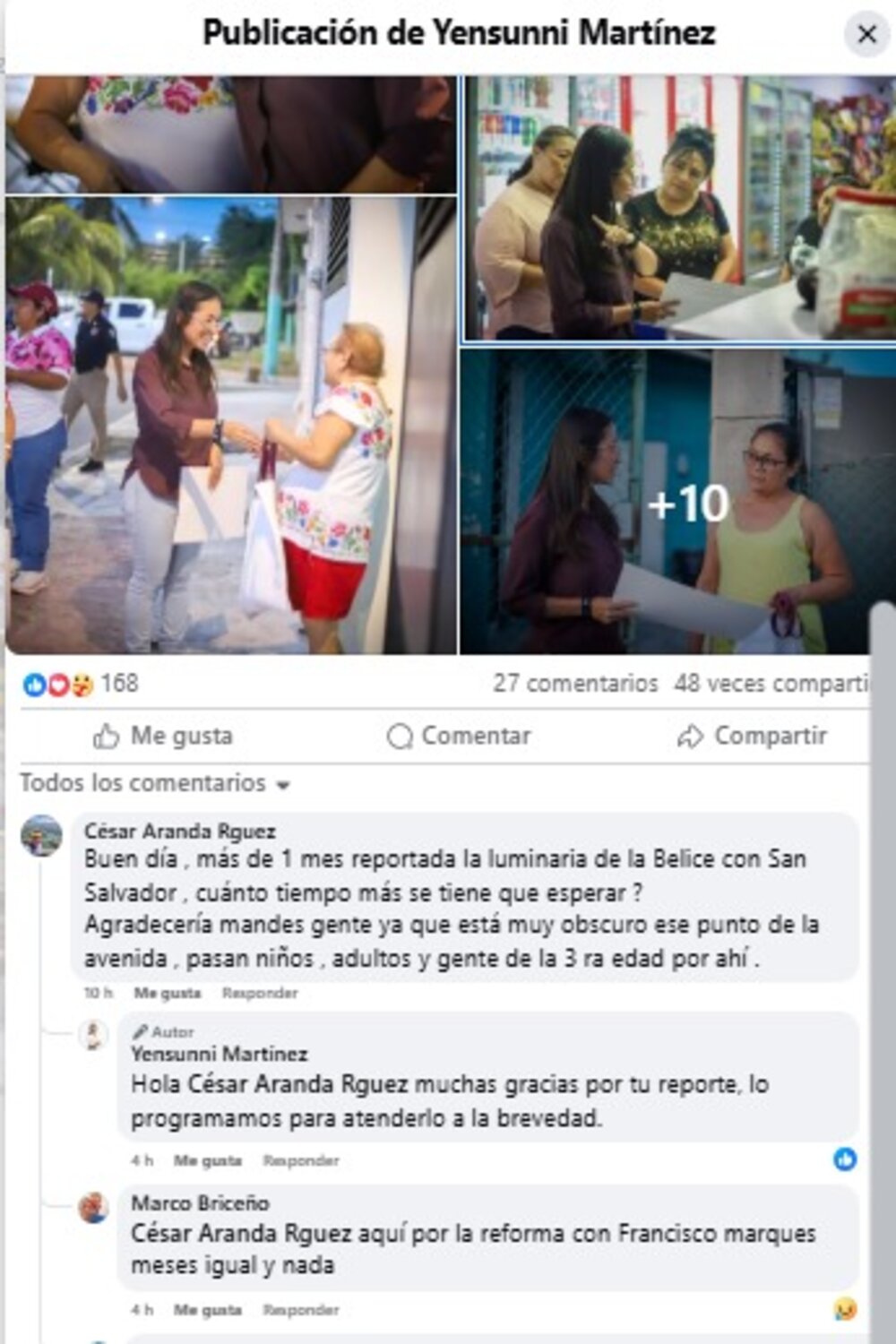CHETUMAL, 14 de octubre. – Las redes sociales se han convertido en un termómetro del descontento ciudadano hacia la administración municipal de Yensunni Martínez Hernández, presidente de Othón P. Blanco. Cada nueva publicación de la edil —sin importar el tema— es rápidamente tomada por los chetumaleños como espacio para expresar quejas sobre servicios públicos deficientes, calles oscuras, baches, y abandono en colonias. En cuestión de horas, las secciones de comentarios se transforman en foros de reclamo, donde las demandas rebasan por completo el mensaje institucional.