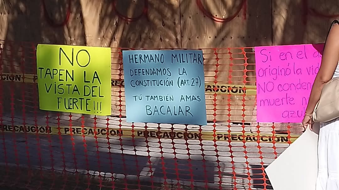 BACALAR, 19 de marzo.- Un grupo de ciudadanos y residentes extranjeros se manifestaron para expresar su rechazo a la construcción que lleva a cabo la Secretaría de la Defensa Nacional (Sedena) junto a la laguna y el fuerte de Bacalar.