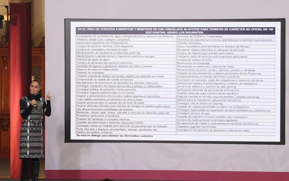 Resaltó que en el área de atención a ministros se han cancelado 59 apoyos para trámites de carácter no oficial de 149 que existían, entre los que se destacan: compra de enseres menores como despensa, apartado de lugares y gestión en estadios de futbol y beisbol; traslado de amistades; traslado urgente de objetos personales dejados en domicilio por olvido; conseguir autógrafos de objetos personales a artistas o celebridades; conseguir boletos de preventa o venta exclusiva; servicios de Ocesa y Ticketmaster; trámites bancarios; inscripción de escuela, pago de colegiaturas y becas; compra de medicamentos.