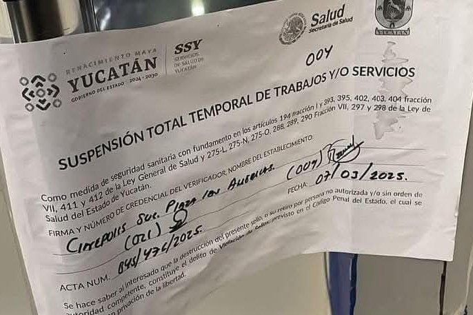 MÉRIDA, YUC.- 8 de marzo.- Como medida de seguridad sanitaria, los Servicios de Salud de Yucatán (SSY) clausuraron de forma temporal el Cinépolis de Plaza las Américas, en Mérida, luego de que se reportara una plaga de cucarachas.