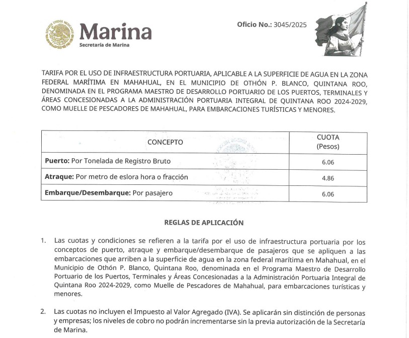 Las tarifas fueron autorizadas por la Dirección General de Puertos de la Secretaría de Marina-Armada de México (Semar), a solicitud del director general de la Apiqroo, Vagner Elbiorn Vega, realizada el 17 de octubre del 2024, según el aviso que fue publicado este martes en el Diario Oficial de la Federación (DOF) para darlas a conocer.