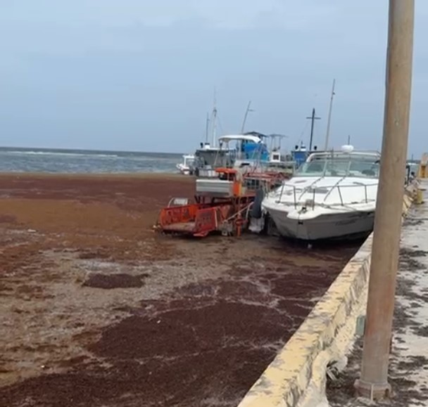 Sin embargo, este muelle lleva varias semanas de este año rodeado por toneladas de sargazo, debido a que por tener enfrente un quebrado, es decir, un área sin barrera arrecifal que permite el paso de las embarcaciones, las macroalgas encuentran ruta abierta hacia la costa de Majahual en este punto.