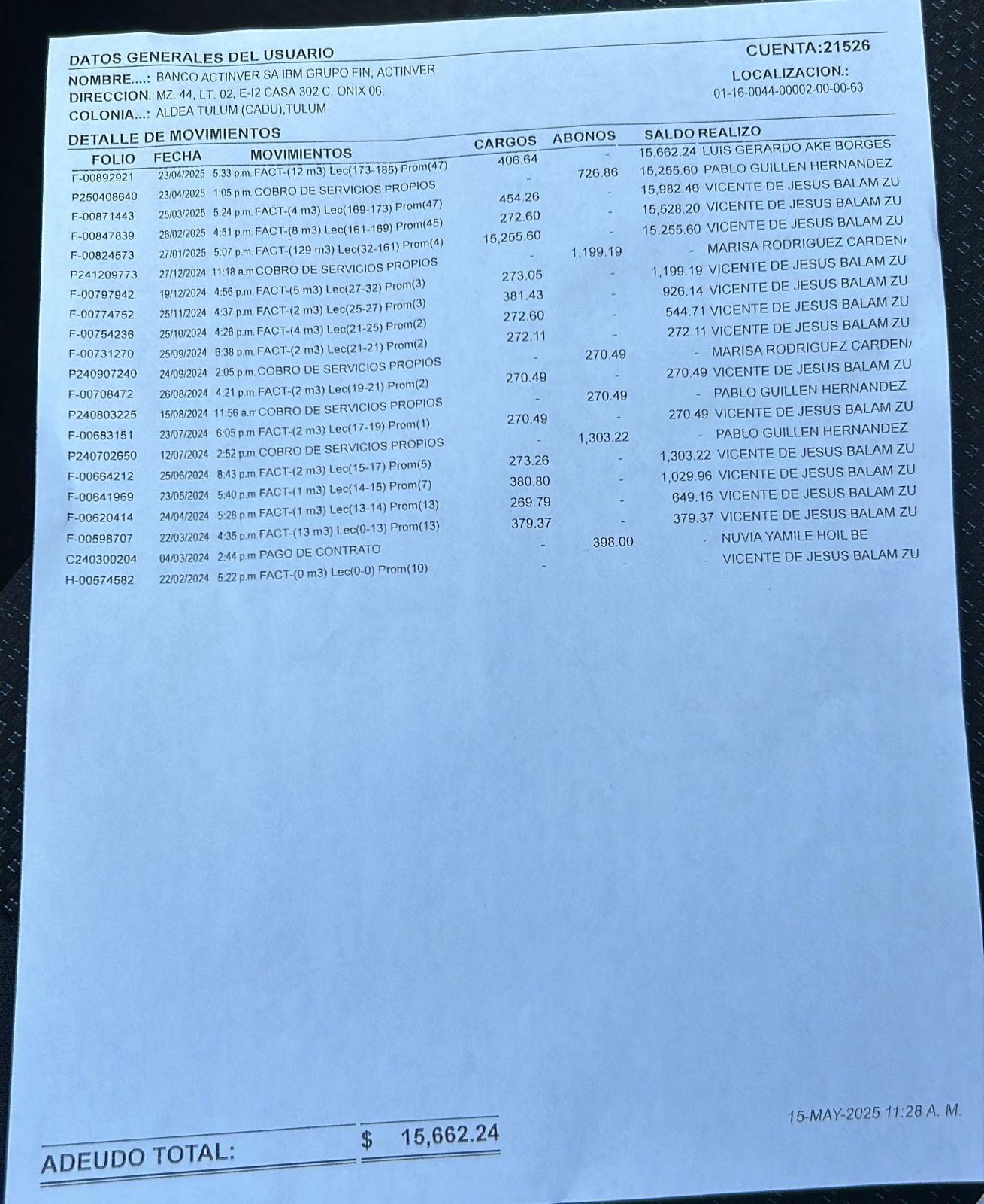 TULUM a 17 de mayo.— La Comisión de Agua Potable y Alcantarillado (CAPA) enfrenta nuevamente cuestionamientos ciudadanos por presuntos cobros indebidos en el municipio de Tulum. Un usuario denunció haber recibido en marzo un recibo por 15 mil 600 pesos, cifra muy por encima del consumo habitual del inmueble, sin explicación técnica clara por parte de la dependencia.