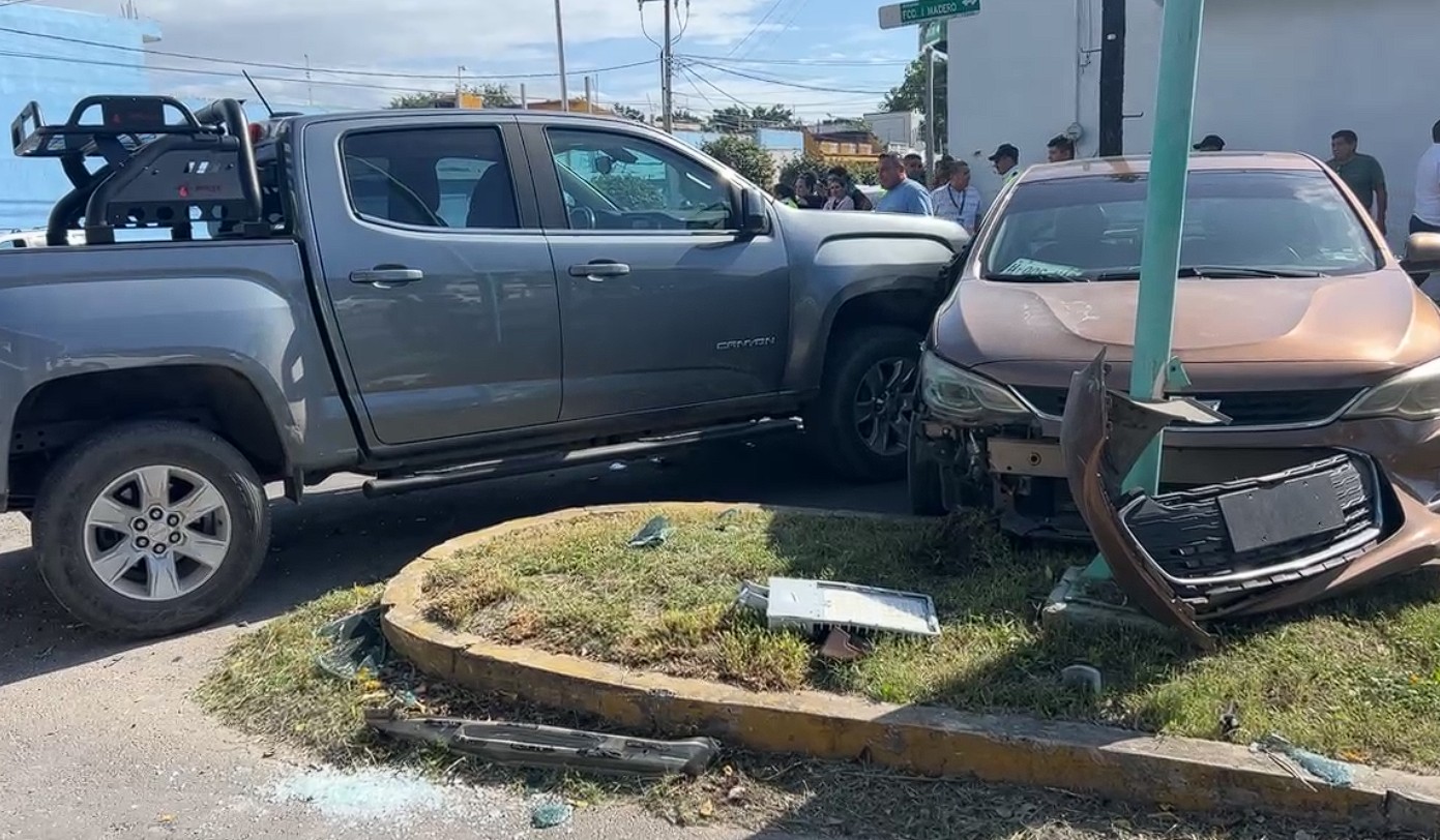 CHETUMAL, 11 de febrero.- Un aparatoso accidente de tránsito se registró la mañana de este martes en la intersección de la avenida José María Morelos con Mahatma Gandhi, en la ciudad de Chetumal. El incidente fue provocado presuntamente por el conductor de una camioneta GMC gris, quien no respetó el alto marcado por disco.