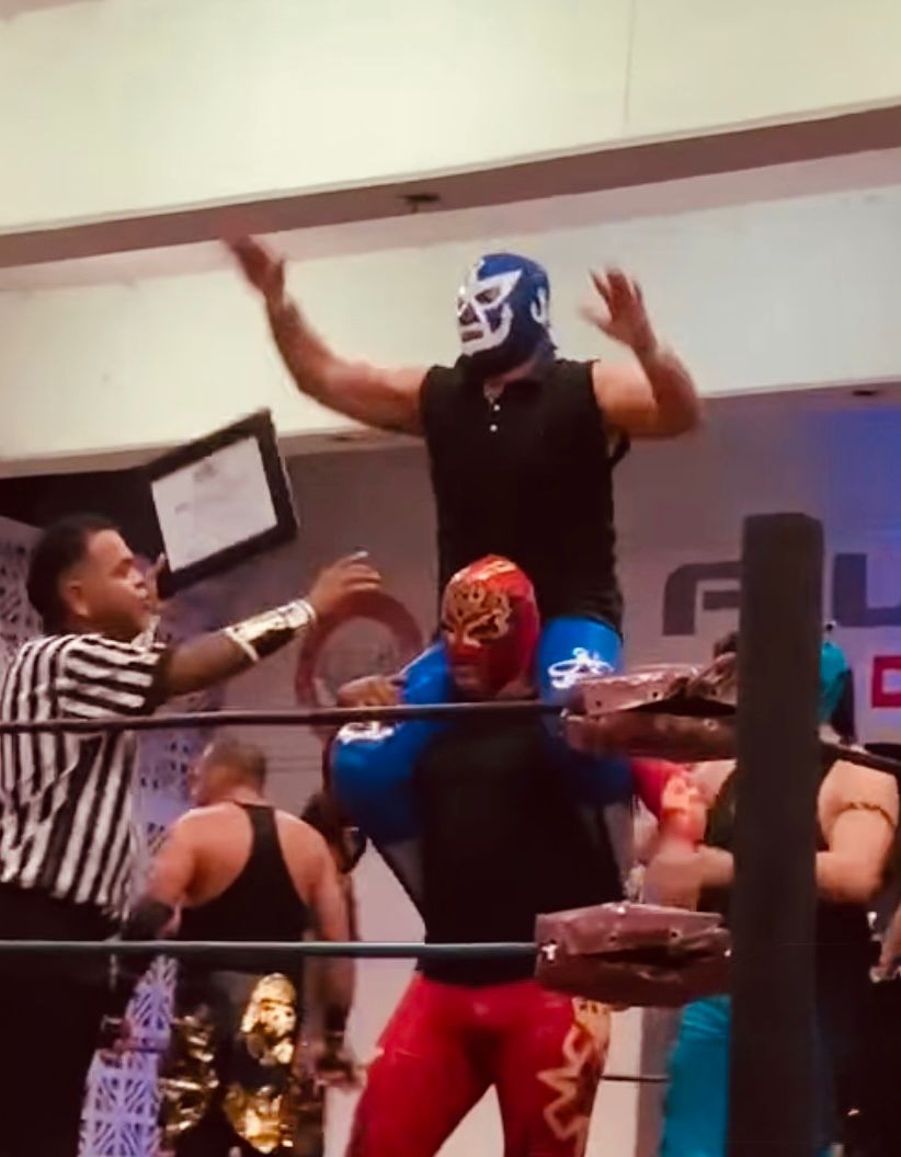 Y es que al terminar la tercera lucha de la noche, en la que precisamente participó El Cadete, se llevó a cabo este homenaje en el que el Corsario Jr. en representación de LLC y Armando “Taurus” Góngora, miembro de la Comisión de Boxeo, Lucha Libre y Artes Marciales Mixtas del municipio de Benito Juárez, le hicieron entrega de un diploma enmarcado por sus 45 impecables años en los cuadriláteros.