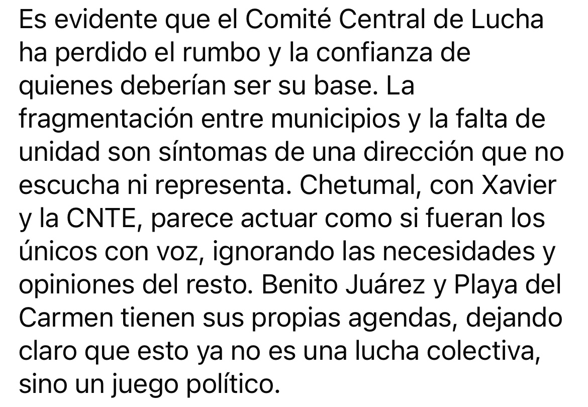 “El magisterio de Quintana Roo representado por el Comité Central de Lucha expresa su más enérgico rechazo y condena las declaraciones emitidas por la secretaria de Educación durante su reciente reunión con docentes de educación indígena; así mismo, denunciamos la actitud irresponsable que aquellos que mediante la difusión de información tergiversada de un doble discurso buscan desvirtuar nuestras legítimas demandas y confrontar a maestros y padres de familia, y ratificamos con firmeza que el paro indefinido continuará hasta que se atiendan nuestras demandas”, expresó en un mensaje en video.