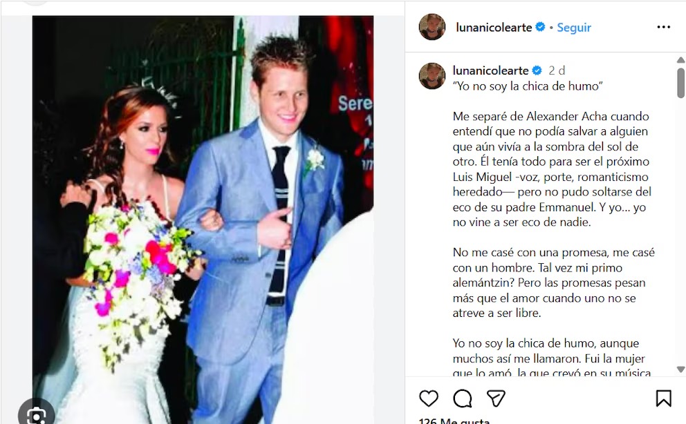 En un giro inesperado, Christiane compartió a través de su perfil de Instagram una imagen del día de su boda con Acha, acompañada de un mensaje donde desmenuza uno de los factores que, según ella, rompieron la relación: la imposibilidad del cantante de “soltarse del eco de su padre”, el icónico Emmanuel.