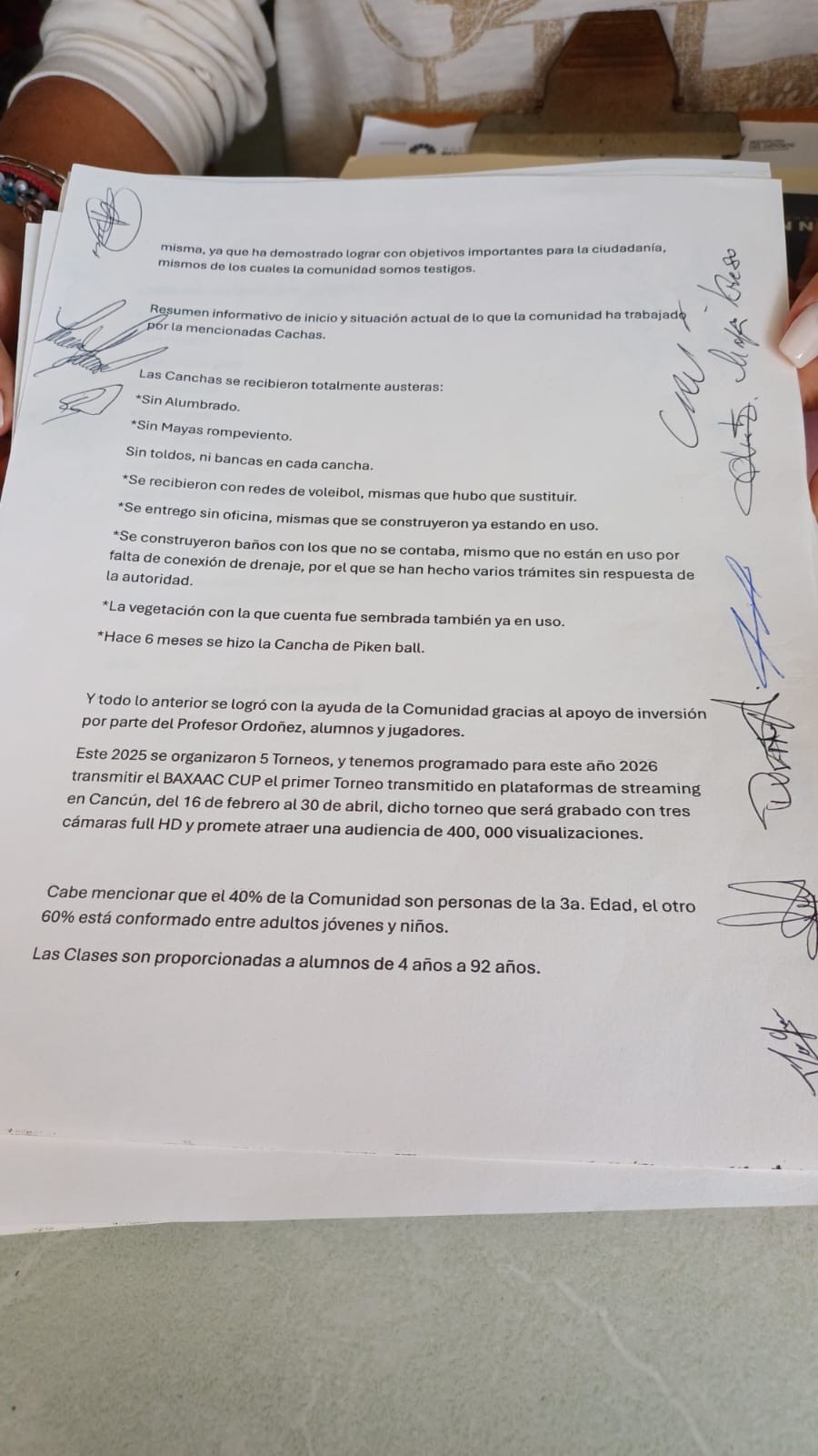 Como protesta, los deportistas colocaron una manta y comenzaron la recolección de firmas, exigiendo que el Ayuntamiento de Benito Juárez dé marcha atrás al retiro de la concesión y respete el carácter público y comunitario de las canchas “8 de Octubre”.