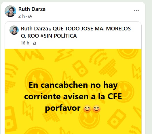 CHETUMAL, 1 de septiembre. – Habitantes de diversas comunidades del municipio de José María Morelos, como Naranjal, Candelaria, Cafetal y Cancabchén, denunciaron a través de redes sociales las constantes fallas en el suministro de energía eléctrica que los han dejado en penumbras durante varias horas en los últimos días. Los reportes ciudadanos reflejan un creciente hartazgo hacia la Comisión Federal de Electricidad (CFE), señalada por la lentitud en la atención de los cortes.