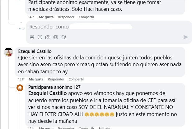 En publicaciones hechas por vecinos, se advierte que la interrupción del servicio no es un hecho aislado, sino un problema recurrente que afecta la vida cotidiana y genera pérdidas económicas. “Constante no hay electricidad aquí, justo en este momento no hay desde la mañana”, expresó un poblador de Naranjal en un grupo comunitario. La situación ha llevado incluso a propuestas de acciones más drásticas, como el cierre de oficinas de la CFE en la región para exigir solución.