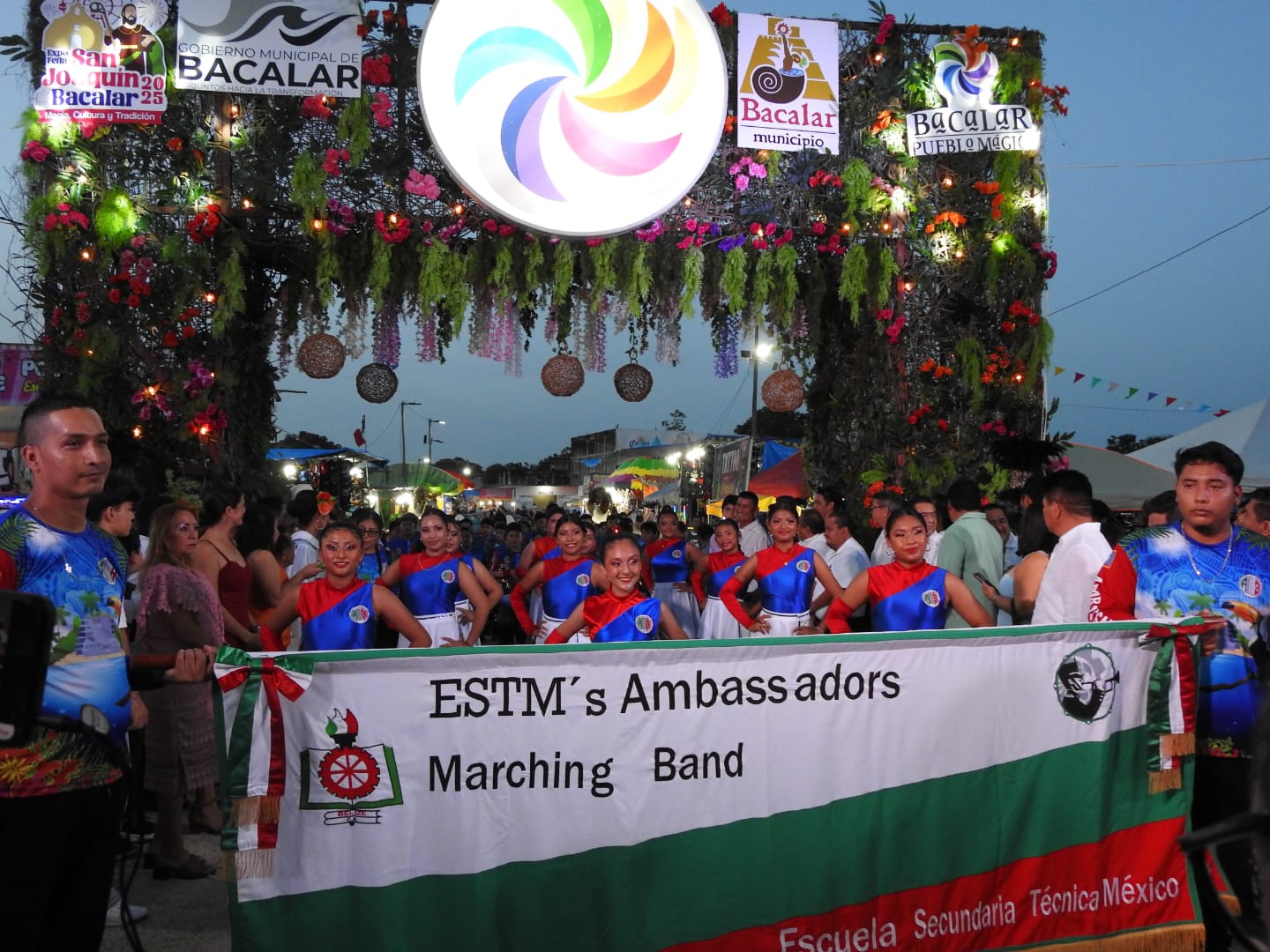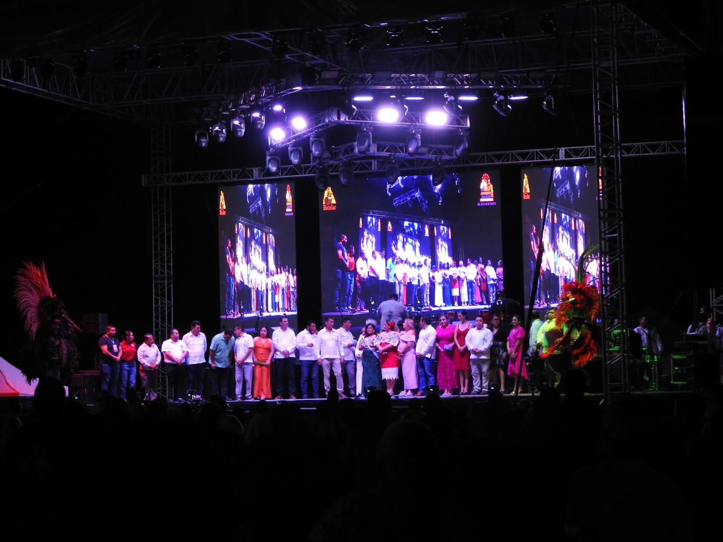 La noche se iluminó con fuegos pirotécnicos y la participación del Grupo Ambassadors Marching Band de Belice, cuya presentación arrancó aplausos por su energía, música y vistosos trajes.
