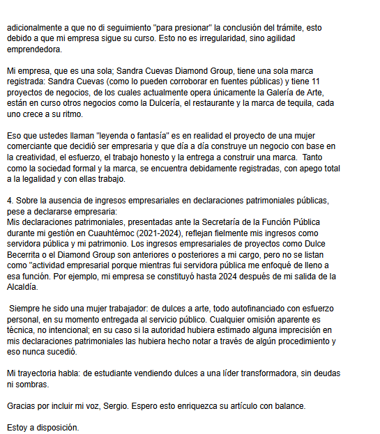 “Mis declaraciones patrimoniales, presentadas ante la Secretaría de la Función Pública durante mi gestión en Cuauhtémoc (2021-2024), reflejan fielmente mis ingresos como servidora pública y mi patrimonio. Los ingresos empresariales de proyectos como Dulce Becerrita o el Diamond Group son anteriores o posteriores a mi cargo, pero no se listan como ‘actividad empresarial’ porque mientras fui servidora pública me enfoqué de lleno a esa función”, aseguró Cuevas.