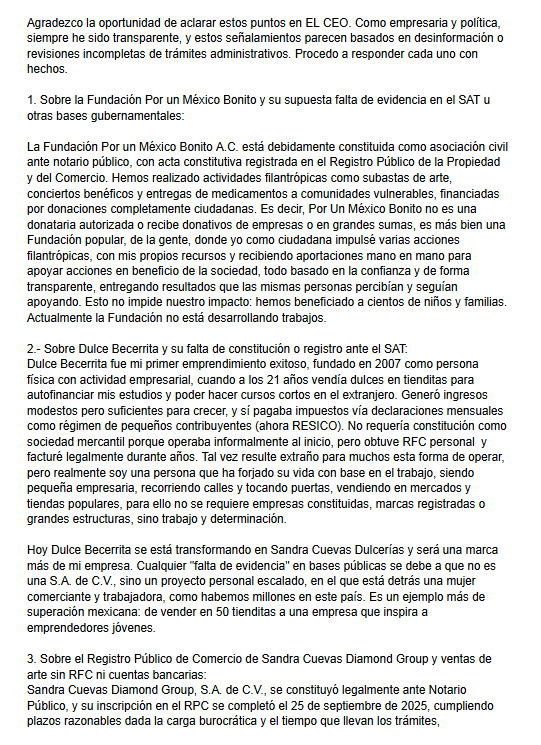 “Sandra Cuevas Diamond Group, S.A. de C.V., se constituyó legalmente ante notario público, y su inscripción en el RPC se completó el 25 de septiembre de 2025, cumpliendo plazos razonables dada la carga burocrática y el tiempo que llevan los trámites, adicionalmente a que no di seguimiento ‘para presionar’ la conclusión del trámite, esto debido a que mi empresa sigue su curso. Esto no es irregularidad, sino agilidad emprendedora”, dijo Sandra Cuevas.