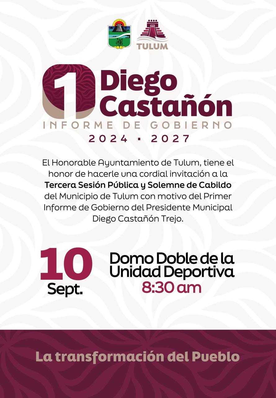 Diego Castañón rendirá su primer informe de su nueva administración en sesión solemne de cabildo programada para las 8:30 de la mañana bajo el Domo Doble de la Unidad Deportiva de Tulum, acto en el que se espera la presencia de la gobernadora del estado, Mara Lezama Espinosa, y representantes de los poderes Legislativo y Judicial.