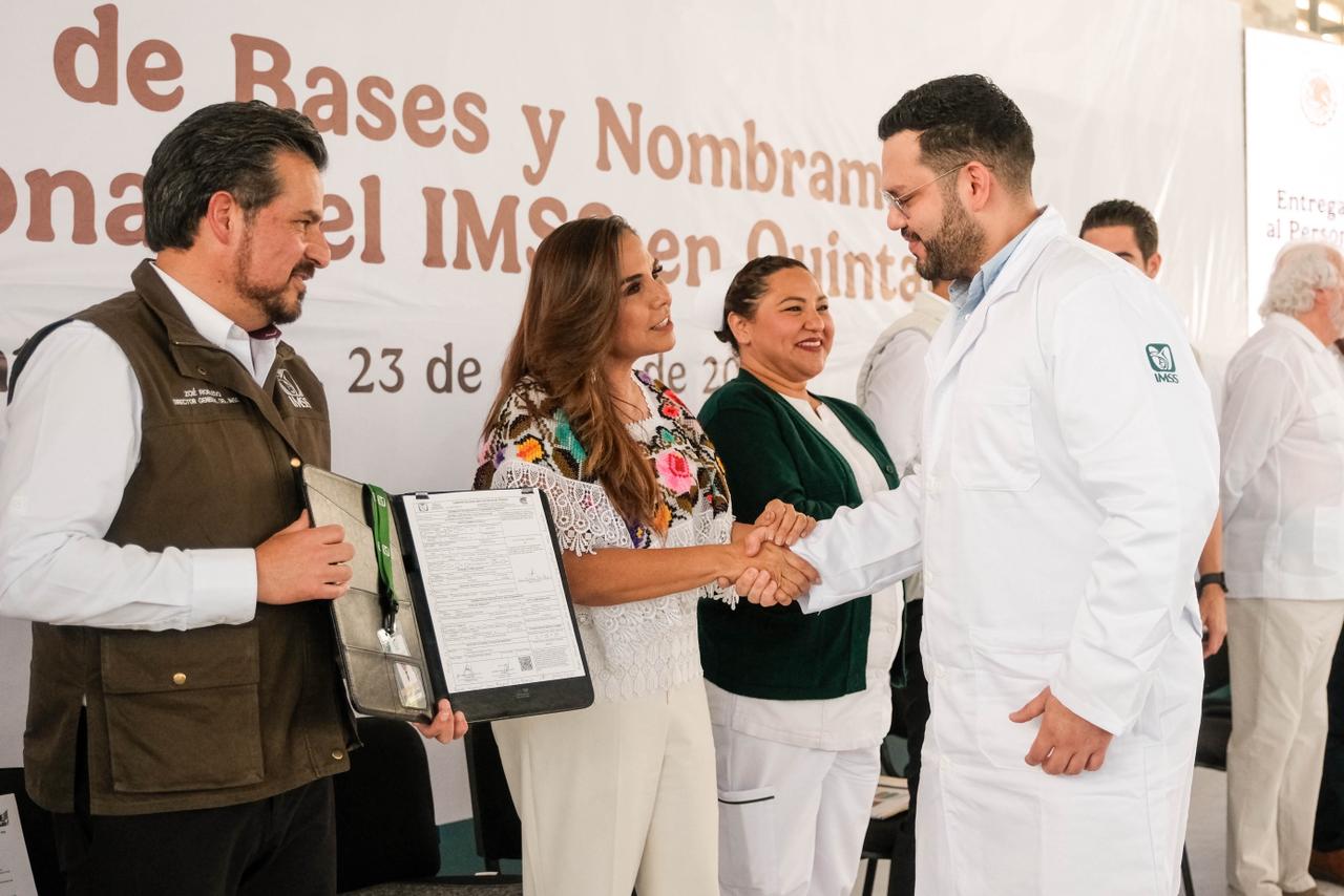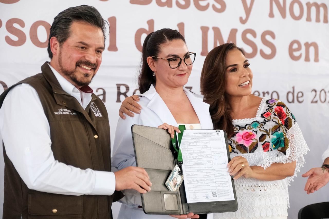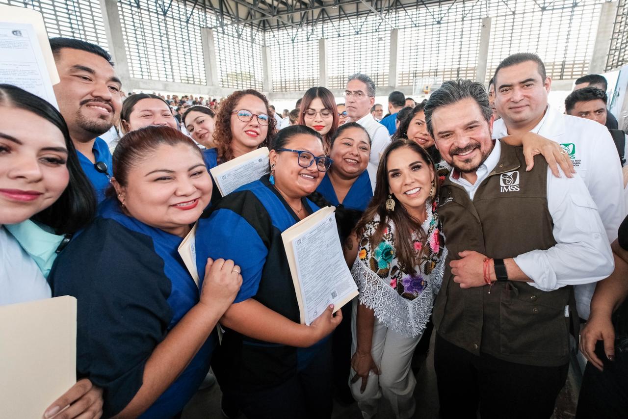 Cancún.- Un total de 71 colaboradoras y colaboradores del Instituto Mexicano del Seguro Social (IMSS) en Quintana Roo recibieron sus bases laborales durante un evento encabezado por la gobernadora Mara Lezama Espinosa y el director general del IMSS, Zoé Robledo.