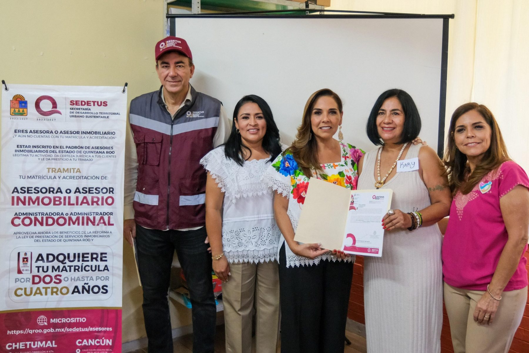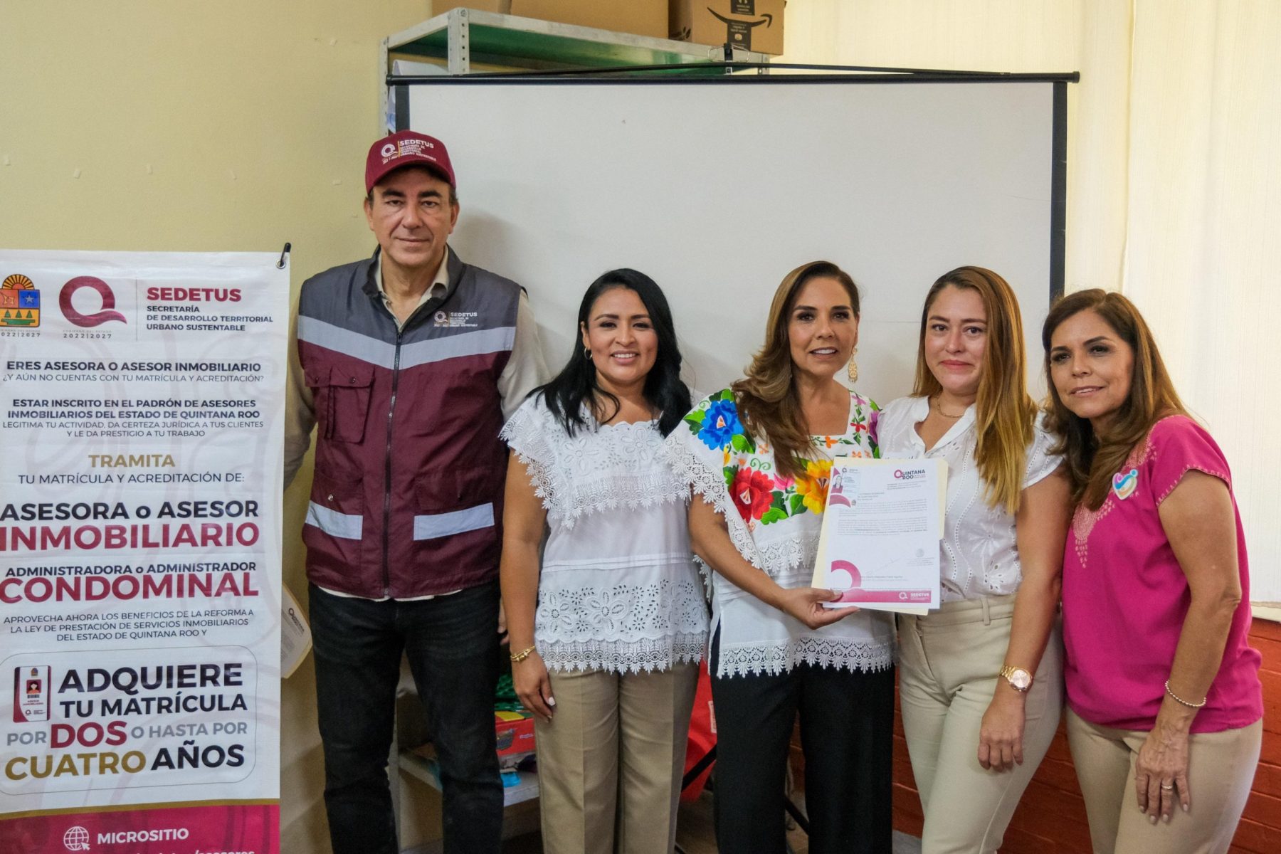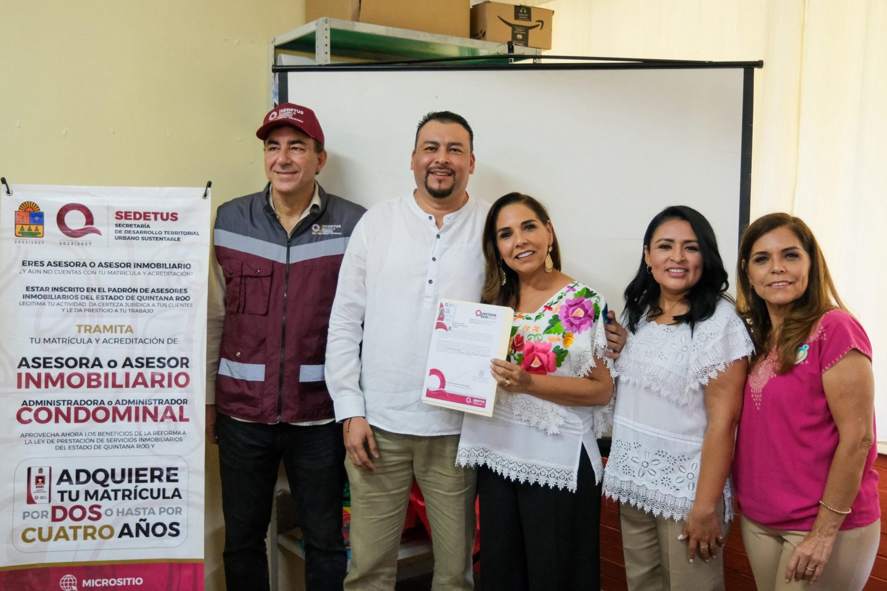 La gobernadora Mara Lezama entregó 5 matrículas a nuevos asesores inmobiliarios del municipio Puerto Morelos, que suman 279 registrados, lo cual permite que la gente que desee comprar un terreno pueda buscar asesoría en ellos y tener la certeza que están comprando de manera legal y orden.