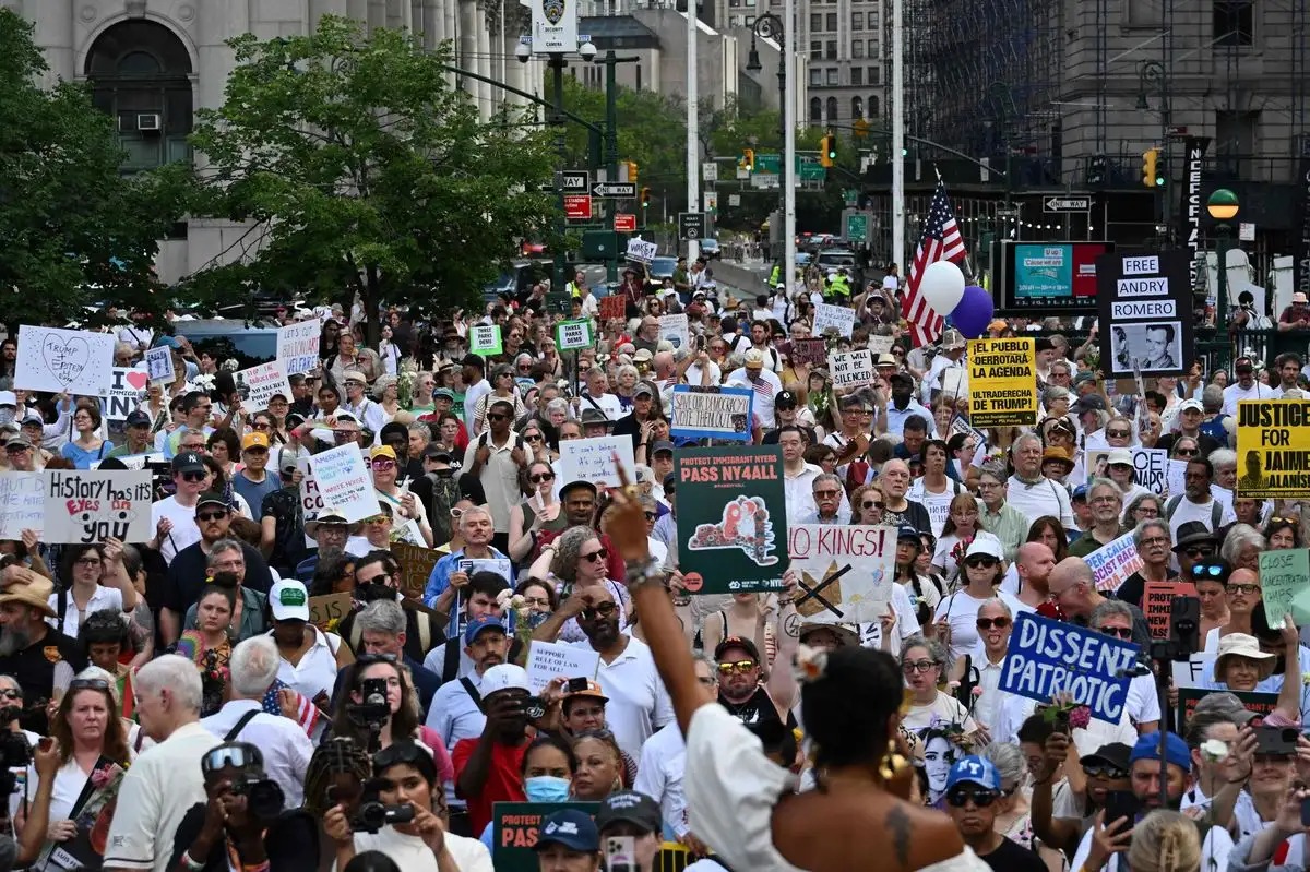 En la ciudad de Nueva York, unas 10 mil personas marcharon por el viejo centro de la ciudad en la punta sur de Manhattan, y alrededor del Edificio Federal donde están, entre otras, las oficinas de la agencia de control migratorio ICE, los tribunales de migración y un pequeño centro de detención, coreando “No al odio, no al miedo, los inmigrantes son bienvenidos aquí” y “Fuera ICE de Nueva York”.