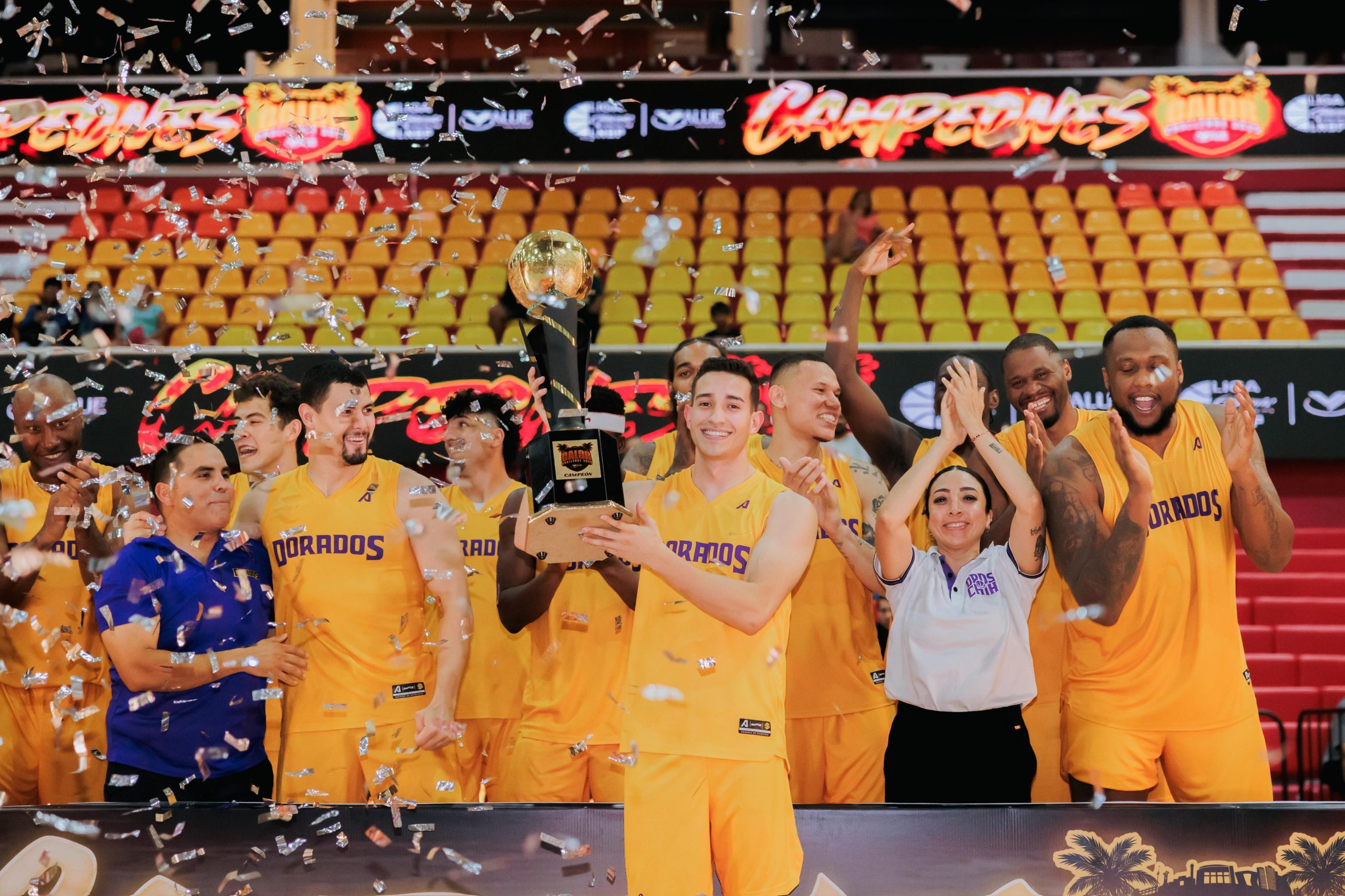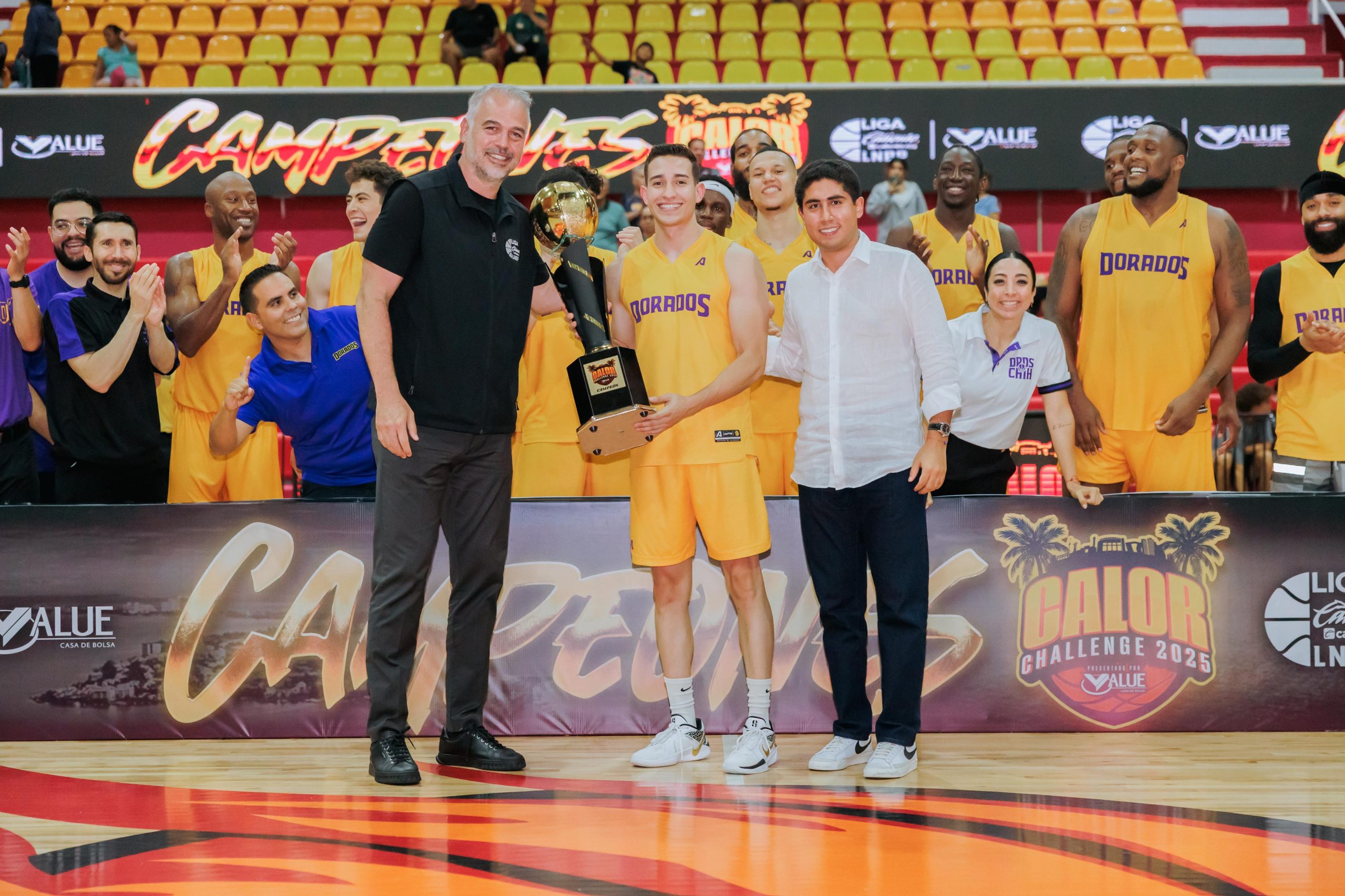 Cancún, Q.R. a 28 de junio.- Con la presencia de casi tres mil aficionados, que hicieron retumbar el Poliforum Cancún, concluyó con éxito la primera edición del “Calor Challenge 2025 Presentado por Value” y que al final, la quinteta de Dorados de Chihuahua se proclamó campeón de este cuadrangular de preparación, tras superar por 76-79 a El Calor de Cancún.