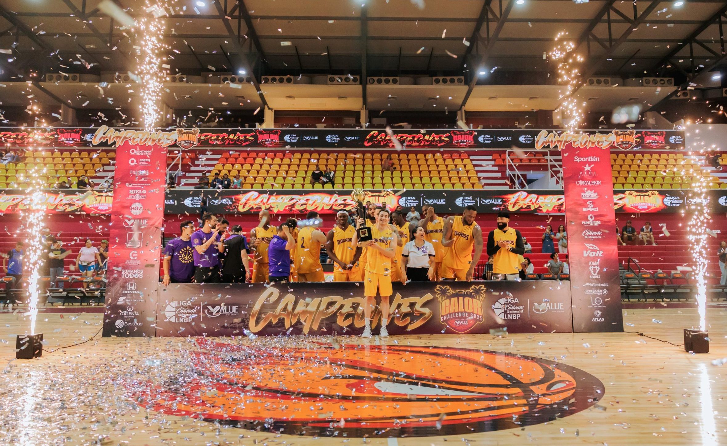 Cancún, Q.R. a 28 de junio.- Con la presencia de casi tres mil aficionados, que hicieron retumbar el Poliforum Cancún, concluyó con éxito la primera edición del “Calor Challenge 2025 Presentado por Value” y que al final, la quinteta de Dorados de Chihuahua se proclamó campeón de este cuadrangular de preparación, tras superar por 76-79 a El Calor de Cancún.