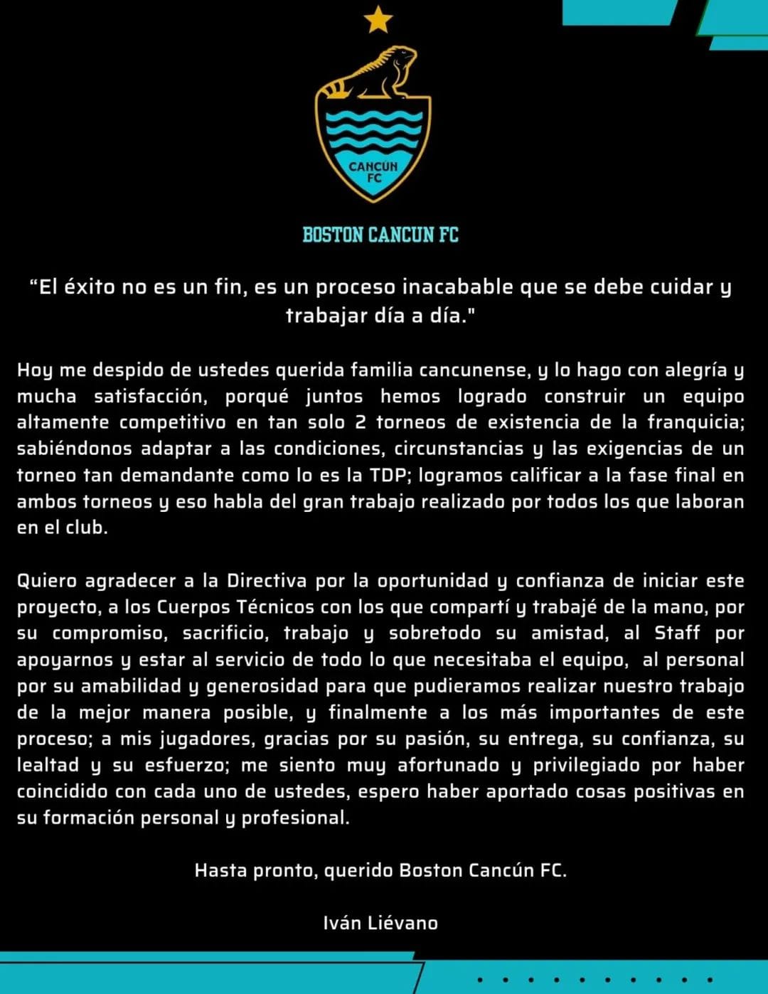 En torno a la salida de Lievano Flores de la institución, esta se dio en los mejores términos, y de hecho, el estratega originario de Atlacomulco, Estado de México; se despidió con un mensaje muy emotivo, dedicado a todos los que tuvieron que ver en su paso por el Boston Cancún FC.