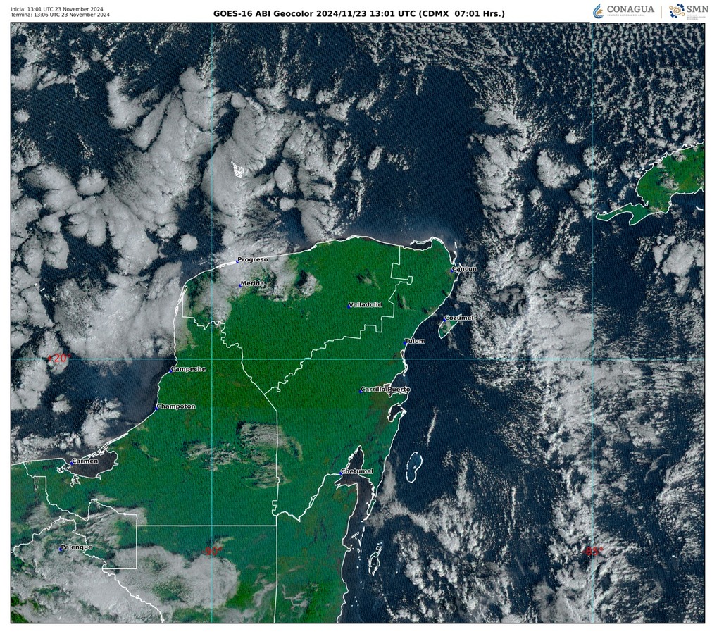 Con base en la sinopsis meteorológica para Quintana Roo, un canal de baja presión, en interacción con la entrada de humedad del mar Caribe, originarán cielo medio nublado a nublado con probabilidad de intervalos de chubascos de 5 a 25 mm en zonas costeras del estado.